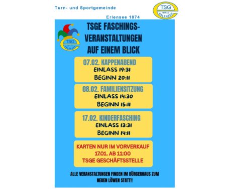 Weiterlesen(pm/ea) – Die Turn- und Sportgemeinschaft Erlensee blickt voller Vorfreude auf die diesjährige Faschingssaison und lädt alle Närrinnen und Narren zu ihren Faschingsveranstaltungen ein. Im Bürgerhaus „Zum Neuen Löwen“ erwartet die Besucher ein buntes Programm für Jung und Alt.