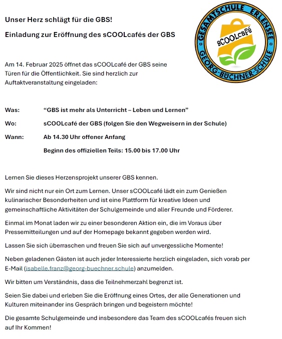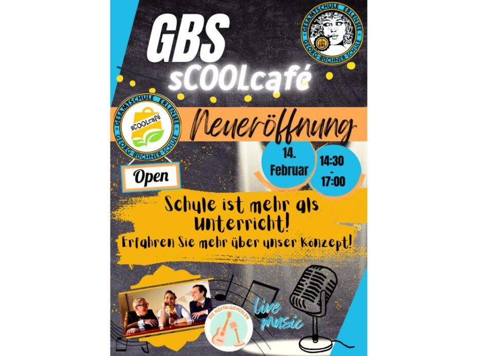 (pm/ea) – Am 14. Februar 2025 öffnet das sCOOLcafé der GBS seine Türen für die Öffentlichkeit. Alle sind herzlich zur Auftaktveranstaltung eingeladen.