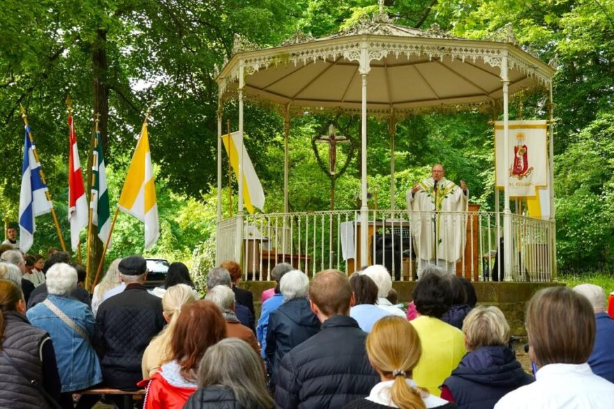 (pm/ea) – „Wie das Sonnenlicht am Morgen auch durch trübe Wolken bricht, so und nicht von ungefähr kommt von Gott die Hilfe her!“ – Der Liedruf passte genau zu Wetter und Stimmung, als bei Vogelgezwitscher und durchbrechender Sonne – unter freiem Himmel – Dechant Andreas Weber die Messfeier am Musikpavillon vor dem Kurhaus in Wilhelmsbad am Hochfest Christi Himmelfahrt zelebrierte.