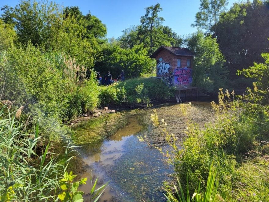 (ms/ea) – Nach dem bedrohlichen Absinken des Wasserstands und Sauerstoffgehalts des kleinen Teiches am Ende der Hattergasse war schnelle Hilfe erforderlich, um dort ein Fischsterben zu verhindern. Nachdem die Stadt Erlensee ein Amtshilfeersuchen an das THW Erlensee gestellt hatte, waren die Helfer schnell vor Ort und beseitigten die Gefahr.