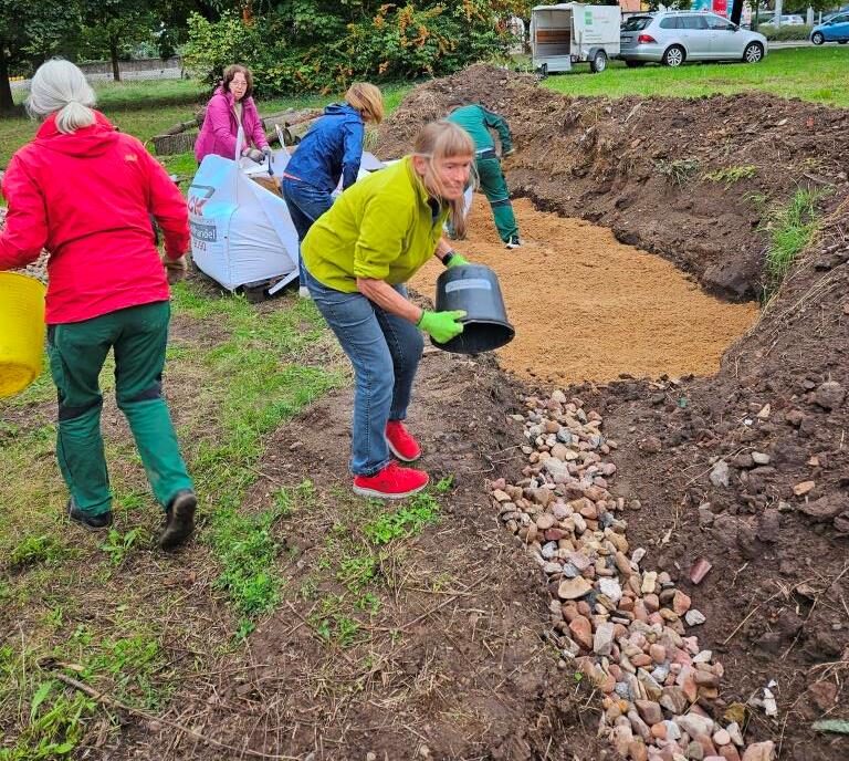Beteiligt waren zudem Mitglieder des Vereins FöPI (Fördernetzwerk heimischer Pflanzen- und Insektenvielfalt), der sich aus den Blühbotschafterinnen zusammensetzt. Mit großem Engagement und fachlicher Expertise halfen Monika Kühn-Bousonville, Karlheinz Lind, Stephanie Wölk, Yvonne Heil, Michael Schneider, Christine Drößler, Brigitte Ulm-Braband und Antje Schöny beim Errichten der Trockenmauer, beim Anlegen des Teiches und des Sandariums.