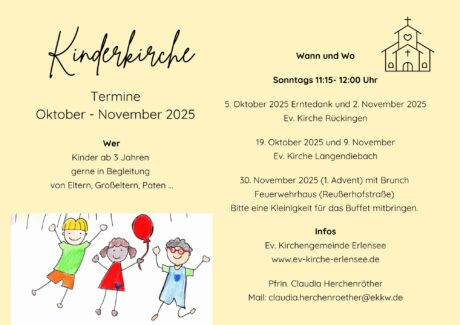Weiterlesen(pm/ea) – Am Sonntag feiern wir schon den 1. Advent und damit feiert die Ev. Kirchengemeinde Erlensee die letzte Kinderkirche in diesem Jahr. Anschließend dürfen alle, die Lust haben, miteinander brunchen.