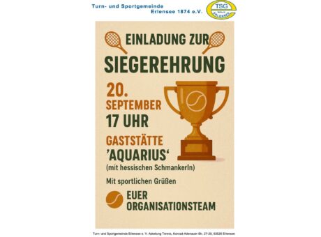 Weiterlesen(pm/ea) – Am kommenden Samstag, 20. September ab 17:00 Uhr, findet auf der Sportanlage der Tennisabteilung der TSG Erlensee die Siegerehrung der diesjährigen Vereinsmeisterschaft statt.